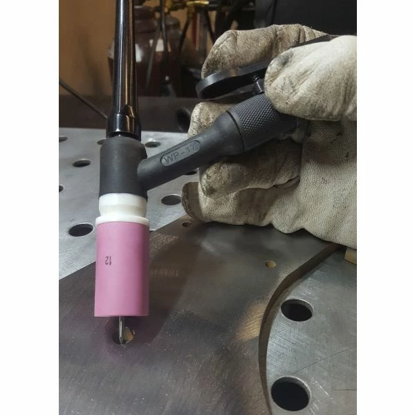 A gas lens improves shielding gas coverage by distributing shielding gas around the tungsten more efficiently with less turbulence than a conventional design. A gas lens also allows the tungsten to protrude further out of the torch for more maneuverability and better visibility of the area you are welding and of the arc itself.